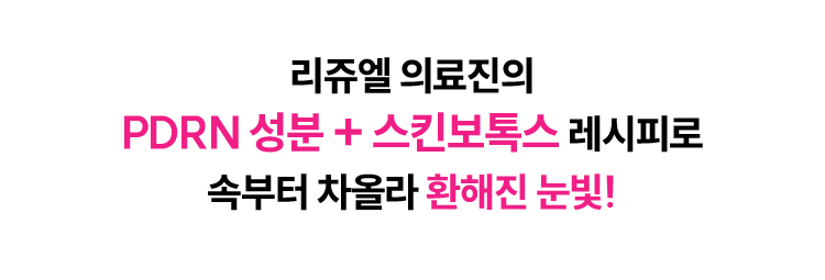 리쥬엘 의료진들의 오랜 임상 경험을 통해 개발된 눈빛주사의 레시피는 PDRN 성분이 눈 밑 손상된 피부 조직을 재생시키고, 스킨보톡스 성분을 통해